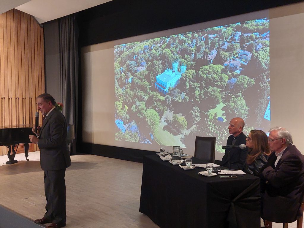 Por ultimo, el Profesor De Masi explicó detalles de la casa castillesca y sus componentes paisajísticos, como modismos suburbanos dinamizados por las nuevas estéticas que trajo el ferrocarril, postulando el sitio como un ejemplo eminente de “patrimonio integral”, donde lo material dialoga con lo inmaterial, y donde la historia y el arte dialogan con el paisaje natural. Asimismo, se destacó la existencia de obras artísticas que adornan y equipan la capilla, obra del maestro argentino Guillermo Buitrago; y otras que pertenecieron a las colecciones del vecino Palacio Sans Souci.
